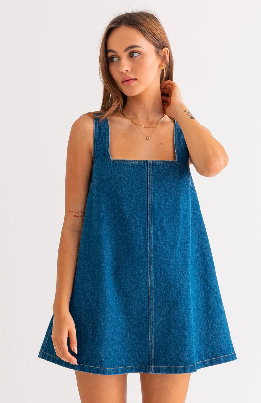 The Denim Dream dress offers effortless style with its flowy design and flattering square neck. Made from durable denim material, this mini dress is perfect for any occasion. ]\